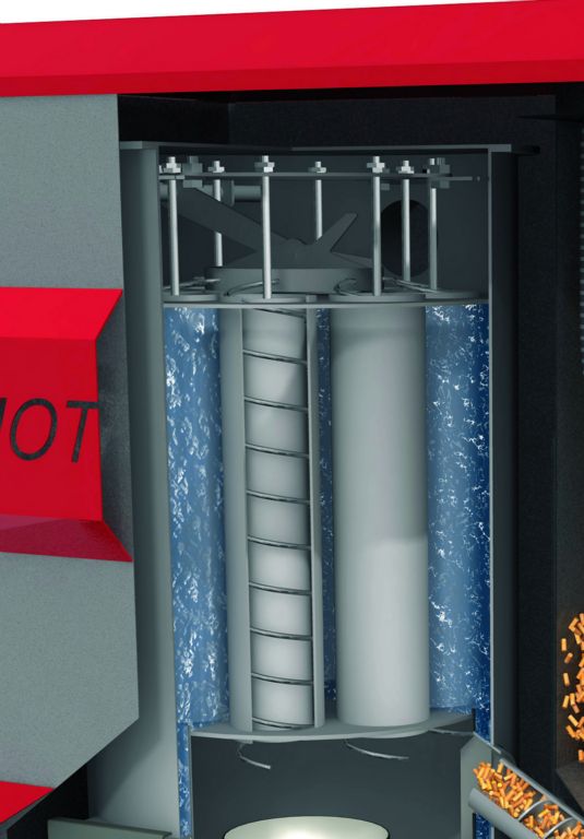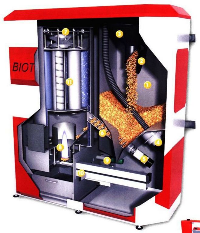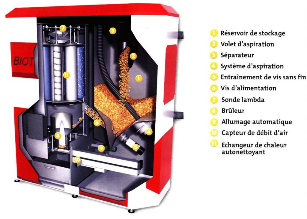 - chaudiere à chargement manuel, remplissage par le haut ( automatisable avec un silo par la suite )